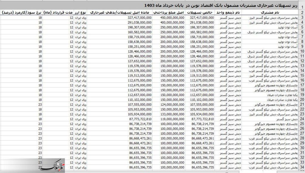 بخشی از اطلاعات مربوط به تسهیلات کلان بانک اقتصاد نوین برای دبش را در ادامه می بینید؛