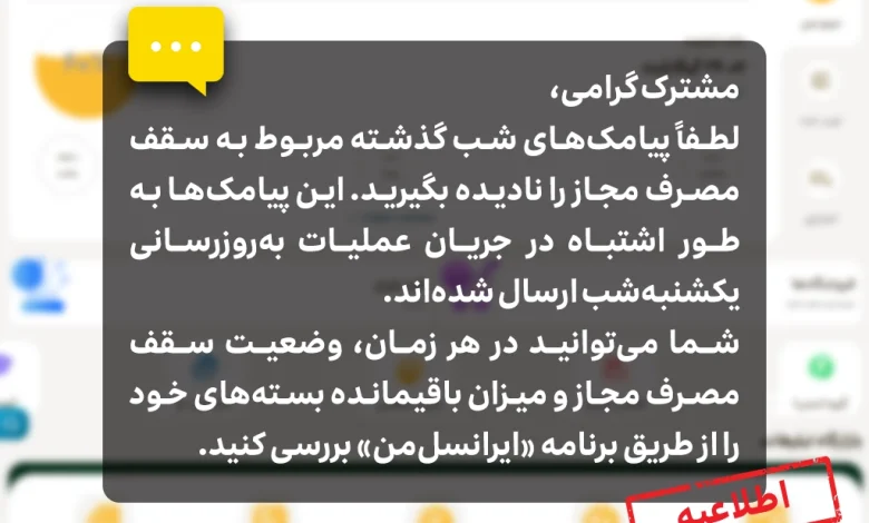 لطفاً پیامکهای شب گذشته مربوط به سقف مصرف مجاز را نادیده بگیرید. این پیامکها بهطور اشتباه، در جریان عملیات بهروزرسانی یکشنبهشب ارسال شدهاند.