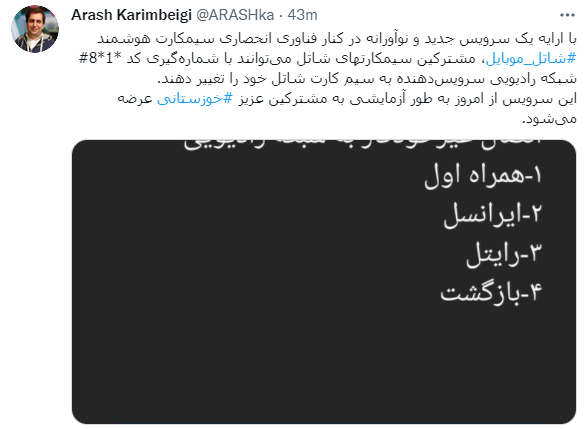 به گزارش خبرنگار تریبون، آرش کریم بیگی گفته است: «با ارایه یک سرویس جدید و نوآورانه در کنار فناوری انحصاری سیمکارت هوشمند #شاتل_موبایل، مشترکین سیمکارتهای شاتل میتوانند با شمارهگیری کد *1*8# شبکه رادیویی سرویسدهنده به سیم کارت شاتل خود را تغییر دهند. این سرویس از امروز به طور آزمایشی به مشترکین عزیز #خوزستانی عرضه میشود.»